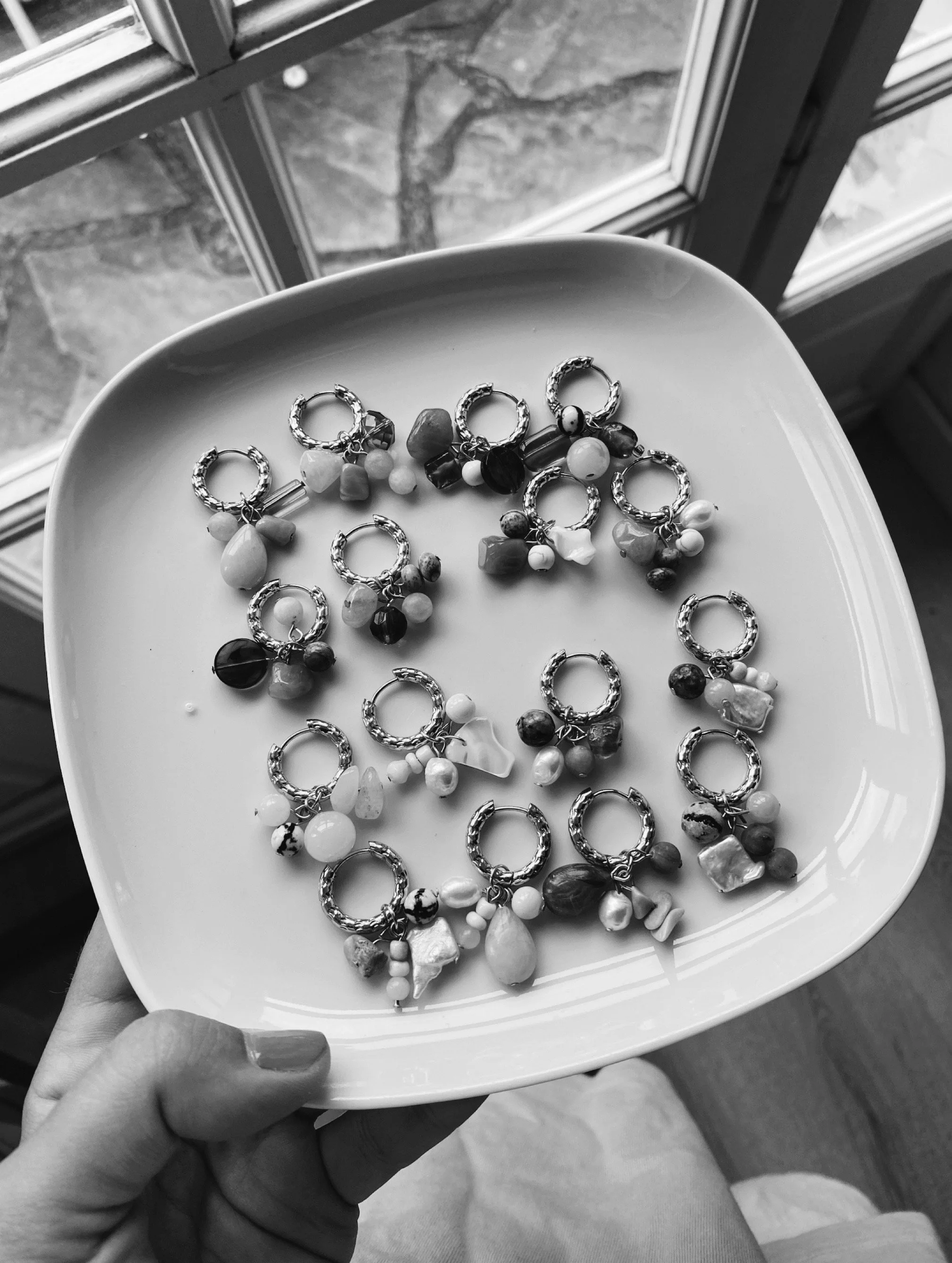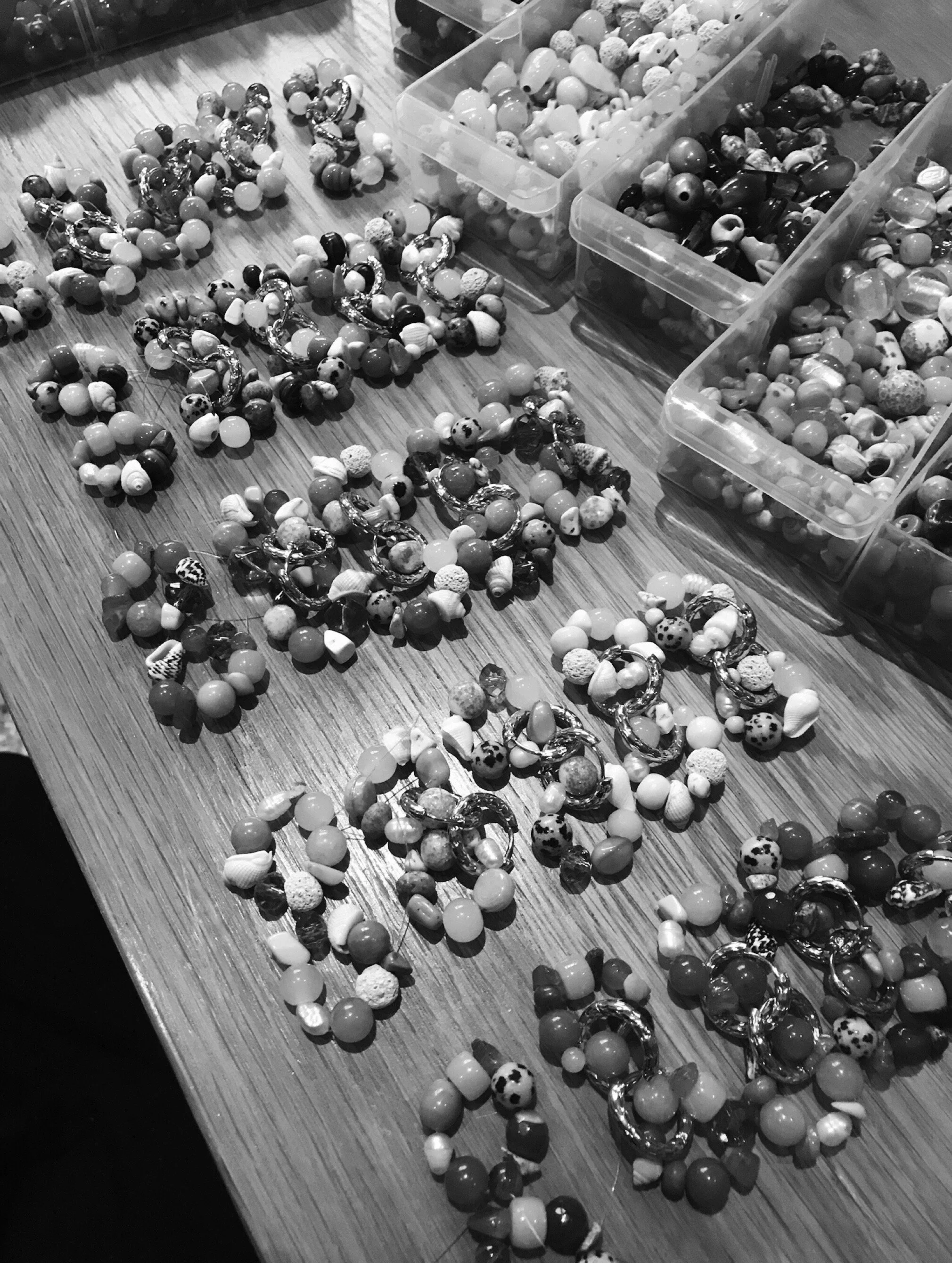 Elles sont composées de perles, de pierres et de coquillages upcyclés récupérés sur des bijoux chinés en brocante.
